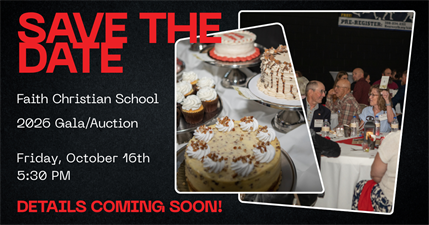 The Faith Christian School Gala & Auction is our premier fundraising event of the year! Guests will enjoy a delicious dinner, live and silent auctions, raffles, and meaningful fellowship — all while supporting the students and mission of Faith Christian School. Every bid and every gift helps provide opportunities that shape lives for Christ and excellence in education.