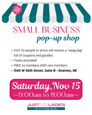 Join us for a small business pop-up shop at Just for Ladies Fitness on Saturday, November 15th from 9-11am. There will be treats, drinks, giveaways and a variety of small businesses to get your holiday shopping off on the right foot. The first 50 through the door will claim a swag bag filled with coupons and goodies! Free to all who attend.