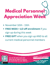 Just for Ladies Fitness would like to honor our community's medical personnel and say "Thank you!" with a FREE WEEK! If you or your immediate family members (women only) are part of any medical facility in town, we'd like to invite you in to enjoy a FREE membership including use of the facilities, all group fitness classes, infrared sauna, tanning, kids' club and MORE. We also have a small gift for every medical personnel and when you join, you also receive 50% off your join fee!
